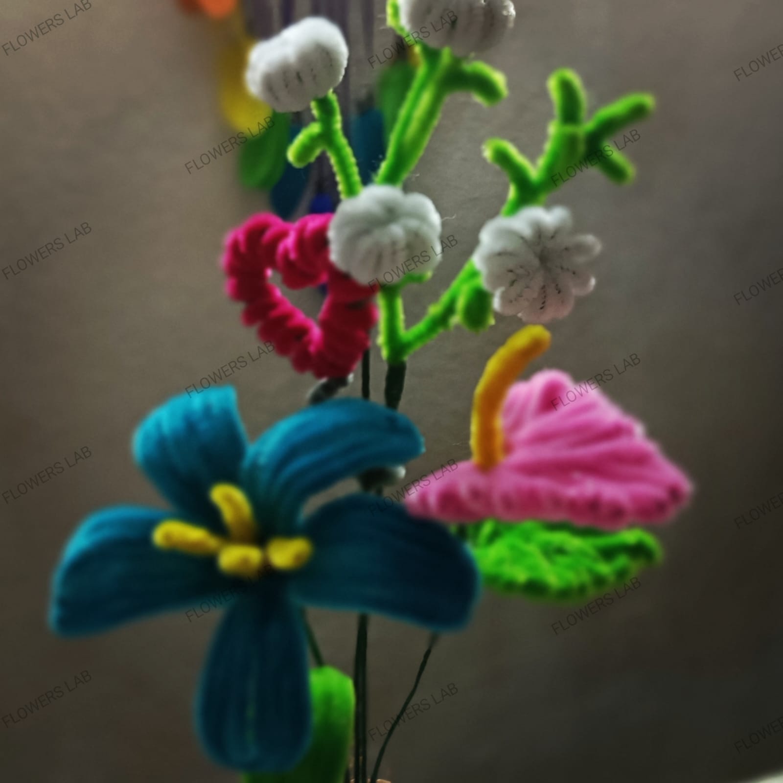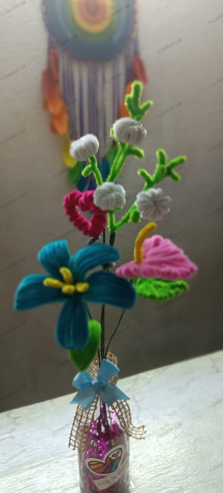 Ramo flores varias, plumeria, anturio, varas de flor silvestre, Adornados con corazón en espiral. Embazado en frasco de cristal con stikers y listón, o en papel de varios colores con listón.